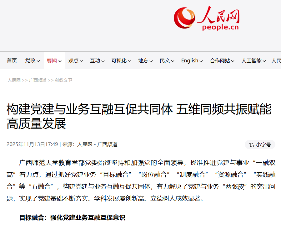 近日,【人民网】关注报道我校教育学部党委创新实施“五维融合”工作机制,有力破解党建与业务“两张皮”难题,推动高质量发展。通过目标融合,教育学部将党建与“一流学科”建设同步规划;通过岗位融合,实行干部双向交叉任职,促进党务与业务干部协同成长;通过制度融合,健全党政联席会议机制,将党建要求嵌入治理体系;通过资源融合,实现经费、场地、平台共享,设立党建科研项目;通过实践融合,打造“教育家精神”大讲堂、“小太阳暖心社”等“党建+”品牌活动。在“五维融合”推动下,我校教育学部党建与业务工作实现双丰收:党委获评自治区党建标杆院系,下属支部获评全国样板支部;新增3个博士学位点,4个专业入选国家级一流本科专业,获6项国家级教学成果奖,并荣获“全国教育系统先进集体”称号。