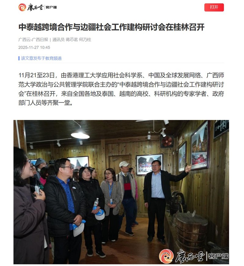 11月27日,【广西云】关注报道中泰越跨境合作与边疆社会工作建构研讨会在桂林召开。此次研讨会由香港理工大学应用社会科学系、中国及全球发展网络、我校政治与公共管理学院联合主办,来自全国各地及泰国、越南的高校、科研机构的专家学者、政府部门人员等齐聚一堂,围绕“跨境人群的需求与相关政策”“文化敏感与社会工作教育”“社区建设与发展”等议题进行交流研讨。