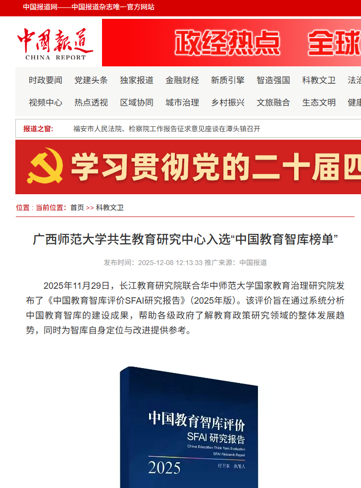 12月8日,【中国报道网】关注报道我校共生教育研究中心在长江教育研究院等单位联合发布的《中国教育智库评价SFAI研究报告》(2025年版)中,成功入选“中国教育智库榜单”,位列全国师范院校智库第十一位。该中心由我校党委副书记、校长、教育部长江学者特聘教授孙杰远担任主任与首席专家,凝聚了一支90余人的专兼职高水平研究队伍。此次入选,标志着我校在教育政策研究与智库建设方面取得了显著进展,社会影响力持续提升。展望未来,我校将继续支持中心深化有组织科研,着力打造具有时代特征与区域特色的研究高地,为国家和地方教育高质量发展提供更坚实的理论支撑与智力支持。