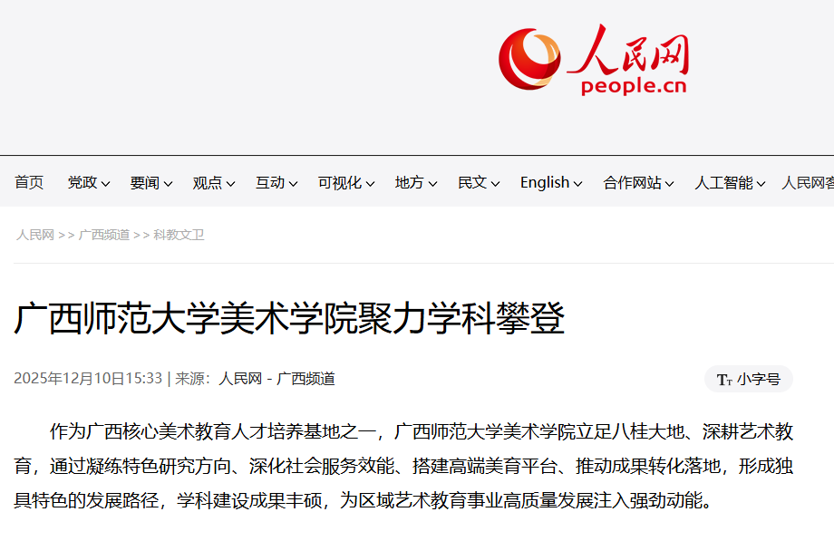 12月10日,【人民网】关注报道我校美术学院聚力学科建设,立足八桂地域文化,凝练出岭南与民族美术研究、喀斯特地貌美术表现、实验艺术创新等特色方向,构建起独具标识的研究体系。美术学院坚持“产学研用”融合,通过校地合作、建立美育实践基地、开展非遗调研等方式,精准对接社会需求,服务乡村文化振兴。美术学院积极搭建高水平交流平台,联合举办实验艺术及油画双年展,常态化开展学科咨询与国际交流,有效拓展了学科影响力。近年来,美术学院科研创作成果丰硕,承担国家级、省部级项目30余项;师生作品屡次入选全国美展等高级别展览,并荣获广西文艺最高奖“铜鼓奖”等重要奖项,实现了人才培养与艺术创作的双重突破。通过特色引领、服务赋能、交流提效、成果落地的发展路径,美术学院已构建起“四位一体”的协同发展格局,持续为区域艺术教育事业与文化强国建设贡献力量。