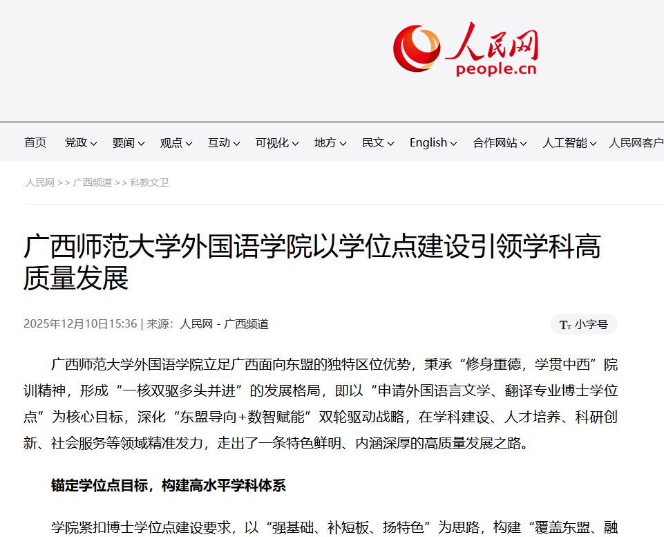 12月10日,【人民网】关注报道我校外国语学院以申请外国语言文学、翻译专业博士学位点为核心,实施“东盟导向+数智赋能”双轮驱动,推动学科高质量发展。外国语学院构建覆盖东盟语种的现代化学科体系,聚焦东盟国别研究、数智化翻译等方向,建设人机协同翻译平台。创新“语言能力+东盟素养+数智技能+科研潜力”培养模式,组建高水平师资队伍,与东盟高校联合培养人才。近三年承担国家级、省部级项目20余项,发表论文300余篇,出版著作56部,横向项目成果显著。我校外国语学院积极服务社会,承担中国—东盟重大活动翻译任务,打造语言服务智库,助力区域发展与中外交流,持续为构建中国—东盟命运共同体贡献力量。