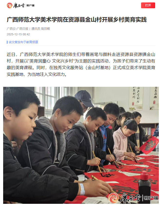 【广西云】关注报道我校美术学院师生赴资源县资源镇金山村开展“美育润童心 文化兴乡村”实践活动。美术学院在金山村独秀文化服务站挂牌成立美育实践基地,旨在建立常态化美育服务机制,定期组织师生为乡村儿童带去绘画、书法、手工等课程。此外,美术学院团队还将结合金山村自然与文化特色,开展乡村环境美化与主题墙绘创作,助力营造人文和谐的乡村风貌。此次合作为金山村注入文化活力,是高校以美育服务乡村振兴的生动实践。