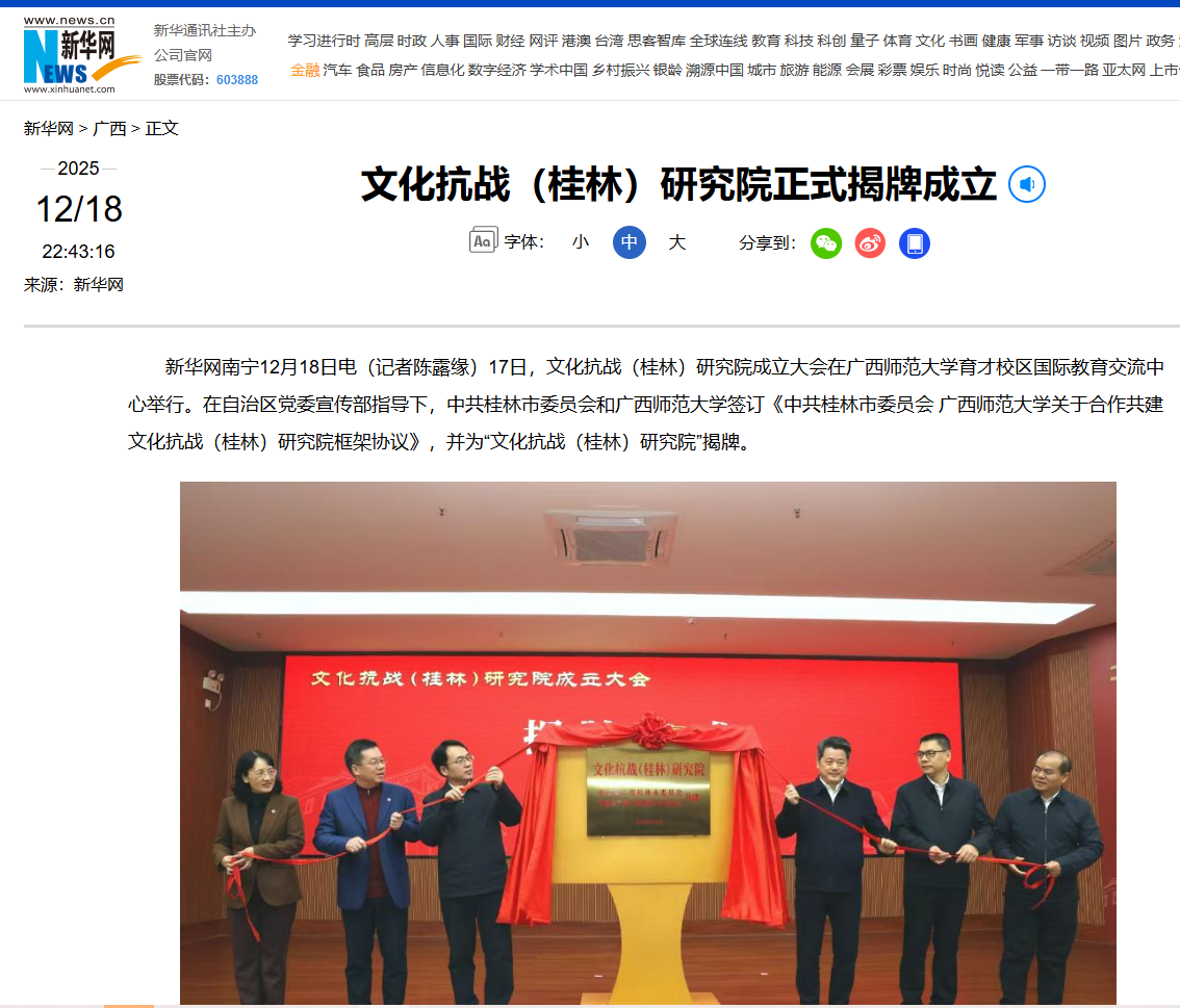 近日,【新华网】关注报道文化抗战(桂林)研究院于12月17日在我校揭牌成立。该研究院由中共桂林市委员会与我校合作共建,旨在通过政校协同模式,深入研究抗战时期桂林作为“文化堡垒”的历史,传承弘扬伟大抗战精神。研究院将聚焦文化抗战理论、专门史及资源开发三大方向,规划实施包括建设博物馆、出版丛书、打造文献中心等在内的“六个一”工程,致力建设成为集学术研究、文化传播、智库功能于一体的高水平平台。