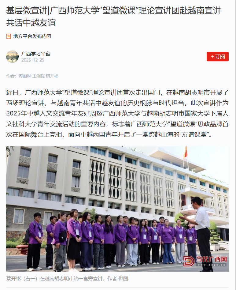 12月25日,【学习强国】关注报道我校“望道微课”理论宣讲团近日首次走出国门,在越南胡志明市开展理论宣讲,共话中越友谊。作为2025年中越人文交流青年友好周相关活动的重要内容,宣讲团成员结合历史物件与感人故事,生动回顾了上世纪大批越南青年赴桂林求学的岁月,阐释了中越“同志加兄弟”情谊的深厚根脉与时代价值。宣讲与当地“红色足迹”研学相结合,实现了理论讲述与实地体验的融合。“望道微课”是我校特色思政品牌,此次海外宣讲是其在国际舞台的首次亮相。活动以青年话语讲述两国共同历史记忆与时代使命,为推动中越人文交流与青年对话进行了有益探索。