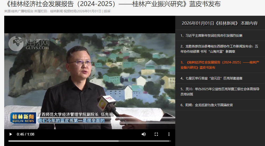 2026年1月1日,【桂林新闻】关注报道由桂林市人民政府指导,广西师范大学、桂林市发展和改革委员会、桂林发展研究院、桂林市世界级旅游城市建设促进局主办的第四届桂林发展论坛在桂林市举行。论坛上,《桂林经济社会发展报告(2024-2025)——桂林产业振兴研究》蓝皮书正式发布。该报告系统剖析了桂林市农业、工业、服务业及旅游业等领域的战略定位、发展基础、实践成效与深层矛盾,并提出了兼具针对性与前瞻性的优化策略。广西师范大学经济管理学院负责人表示,本次发布的蓝皮书具有显著的系统性和深刻性,不仅全面梳理了桂林产业振兴的整体脉络,更对发展过程中遇到的突出问题与可供借鉴的典型模式作出了深入剖析与系统总结,为下一阶段的实践提供了重要参考。