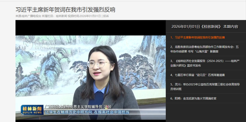 近日,【桂林新闻】关注报道我校马克思主义学院组织师生学习观看习近平主席2026年新年贺词。贺词中对包括青年在内的全体奋斗者的肯定与期许,在师生中引发热烈反响。大家纷纷表示,将以奋斗姿态激扬青春,厚植家国情怀,以实际行动践行“请党放心,强国有我”的誓言。2026年是“十五五”规划开局之年,师生们深刻认识到“开好局、起好步”的重要意义。师生一致表示,将以永不懈怠的精神状态,将贺词精神转化为脚踏实地行动,在新征程中书写无愧于时代的青春篇章。