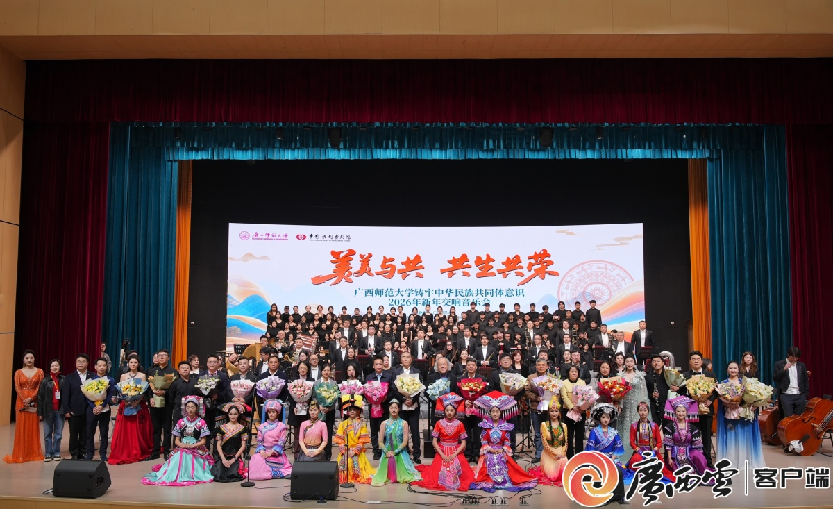 近日,《广西日报》【广西云】关注报道我校在雁山校区举办“美美与共·共生共荣”铸牢中华民族共同体意识2026年新年交响音乐会。音乐会由校美育中心、音乐学院等单位联合承办,并特邀中国歌剧舞剧院交响乐团共同演出,通过交响乐形式生动展现中华民族多元一体文化格局,传递民族团结的时代强音。作为落实“教育强桂”“人文兴桂”战略的重要举措,我校始终紧扣铸牢中华民族共同体意识主线,积极将民族团结教育融入育人全过程。此次活动以艺术凝聚共识,为营造民族团结校园氛围、服务中华民族共同体建设贡献了力量。
