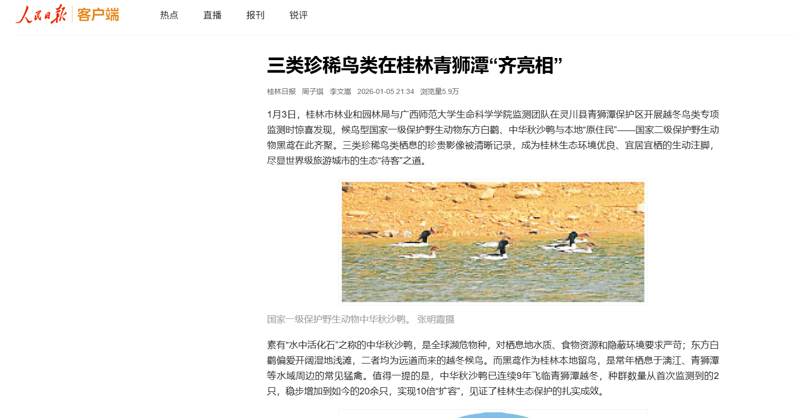 近日,【人民日报】客户端关注报道我校联合桂林市林业和园林局,于1月3日在灵川县青狮潭保护区开展鸟类监测时,记录到国家一级保护野生动物东方白鹳、中华秋沙鸭与国家二级保护野生动物黑鸢齐聚的景象。学校科研团队长期参与该区域生态监测,助力构建“巡护监测+执法监管+科普宣传”一体化保护体系。桂林持续加强生态修复与栖息地保护,推动青狮潭成为“候鸟天堂”。我校将进一步深化与地方合作,常态化开展野生动植物监测,为筑牢生态基底、绘就人与自然和谐共生画卷提供科研支持。