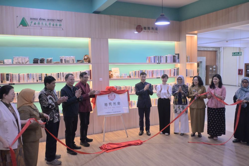 近日,【新华社】客户端关注报道独秀书房·印度尼西亚玛琅国立大学孔子学院阅读体验中心正式揭牌。该中心由广西师范大学、玛琅国立大学与广西师范大学出版社集团三方共建,是我校推动海外文化传播与合作的又一重要成果。该中心集图书阅览、文化展示与学术交流于一体,目前上架千余册精选图书与百余种文创产品,涵盖文学、社科、汉语学习等多个门类。这是继越南、泰国之后,我校在海外合作设立的第3家“独秀书房”,成为促进我国与印尼人文交流与民心相通的新平台。