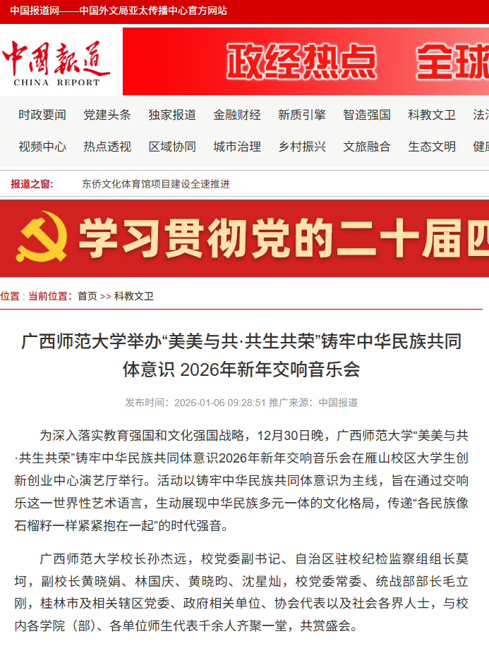 【中国报道网】关注报道我校举办“美美与共·共生共荣”铸牢中华民族共同体意识2026年新年交响音乐会。活动于12月30日晚在雁山校区举行,校领导、各界代表及千余名师生共同观赏。音乐会由校美育中心、音乐学院、中华民族共同体研究院联合承办,携手中国歌剧舞剧院交响乐团演出。指挥家许知俊执棒,歌唱家王铁刚与学校教师同台献艺。曲目融合《春节序曲》等民族经典、多民族风情乐曲及《我爱你中国》等时代旋律,彰显中华美学与交响乐形式的结合。学校紧扣铸牢中华民族共同体意识主线,通过音乐盛宴推进文化育人,凝聚团结共识,服务民族团结进步事业,为谱写中华民族伟大复兴篇章贡献力量。