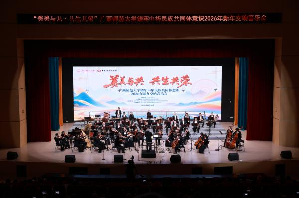 为深入落实教育强国和文化强国战略,12月30日晚,广西师范大学“美美与共·共生共荣”铸牢中华民族共同体意识2026年新年交响音乐会在雁山校区大学生创新创业中心演艺厅举行。活动以铸牢中华民族共同体意识为主线,旨在通过交响乐这一世界性艺术语言,生动展现中华民族多元一体的文化格局,传递“各民族像石榴籽一样紧紧抱在一起”的时代强音。