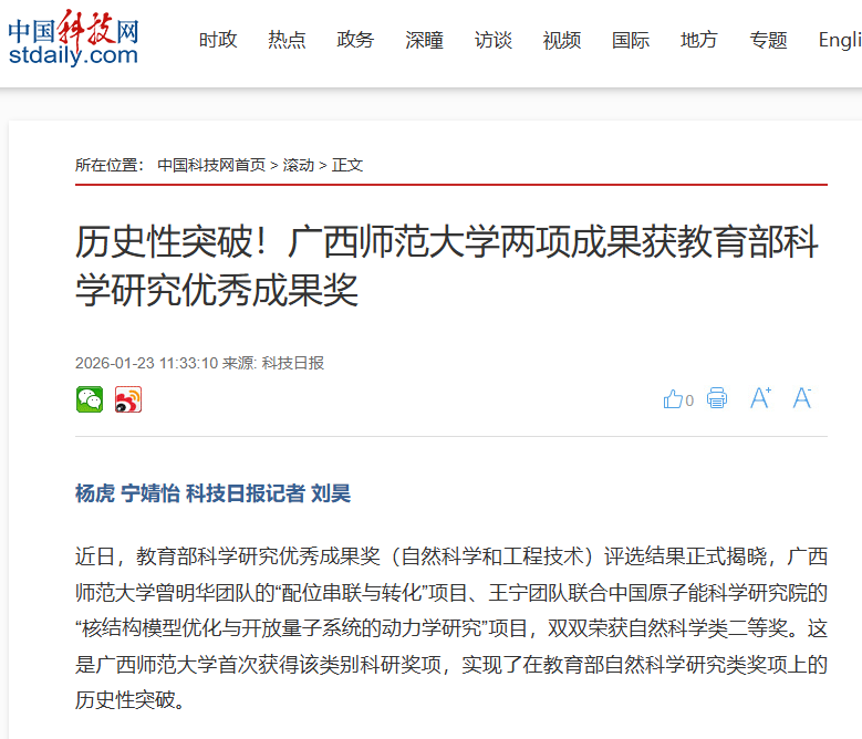 近日,教育部科学研究优秀成果奖(自然科学和工程技术)评选结果正式揭晓,广西师范大学曾明华团队的“配位串联与转化”项目、王宁团队联合中国原子能科学研究院的“核结构模型优化与开放量子系统的动力学研究”项目,双双荣获自然科学类二等奖。这是广西师范大学首次获得该类别科研奖项,实现了在教育部自然科学研究类奖项上的历史性突破。