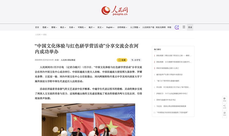 近日,【人民网】关注报道了由广西壮族自治区教育厅主办、我校承办的“重走先辈路,赓续中越情”中越青年师生红色研学营活动,和在河内中国文化中心成功举办的“中国文化体验与红色研学营活动”分享交流会。