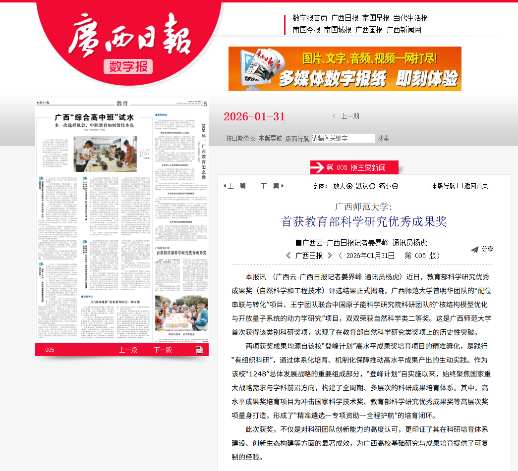 近日,【广西日报】关注报道我校首次获得教育部科学研究优秀成果奖(自然科学和工程技术),实现该校在该类奖项上历史性突破。曾明华团队的“配位串联与转化”项目、王宁团队联合中国原子能科学研究院的“核结构模型优化与开放量子系统的动力学研究”项目,双双荣获自然科学类二等奖。两项成果均源自该校“登峰计划”高水平成果奖培育项目的精准孵化,是践行“有组织科研”、系统培育高水平成果的体现。此次获奖印证了学校在科研培育与创新生态建设方面的成效,为广西高校基础研究与成果培育提供了有益经验。