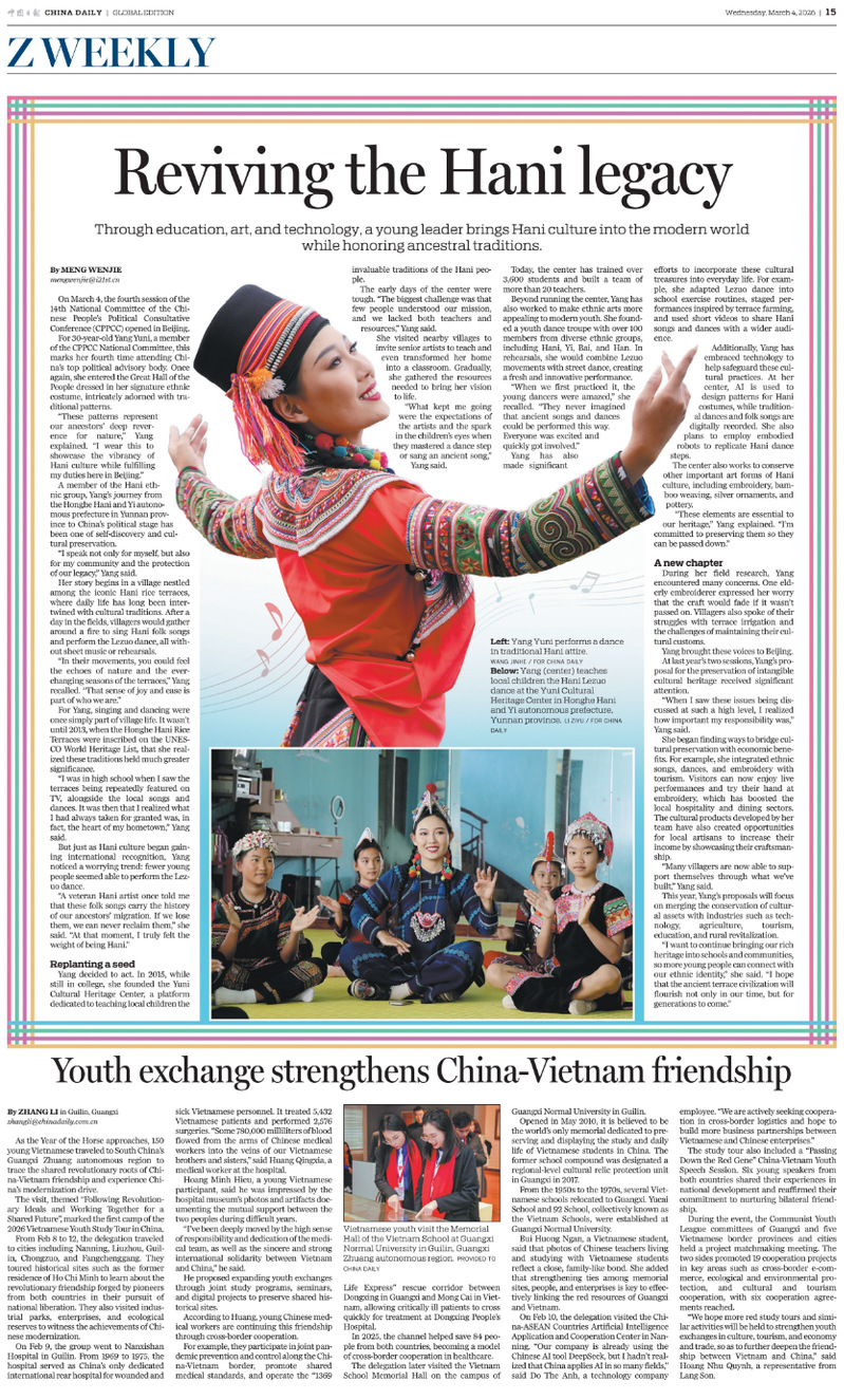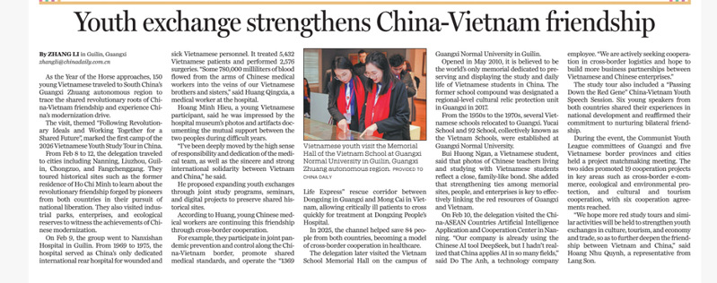 近日,【中国日报(CHINA DAILY)】以《Youth exchange strengthens China-Vietnam friendship》为题,报道了中越青年代表团到访我校的交流活动。此次活动以 “青春相约,友谊同行” 为主题,中越青年代表通过参观越南学校纪念馆、开展座谈交流等形式,重温中越传统友谊,共商青年合作新路径,为深化两国友好关系注入青春动能。