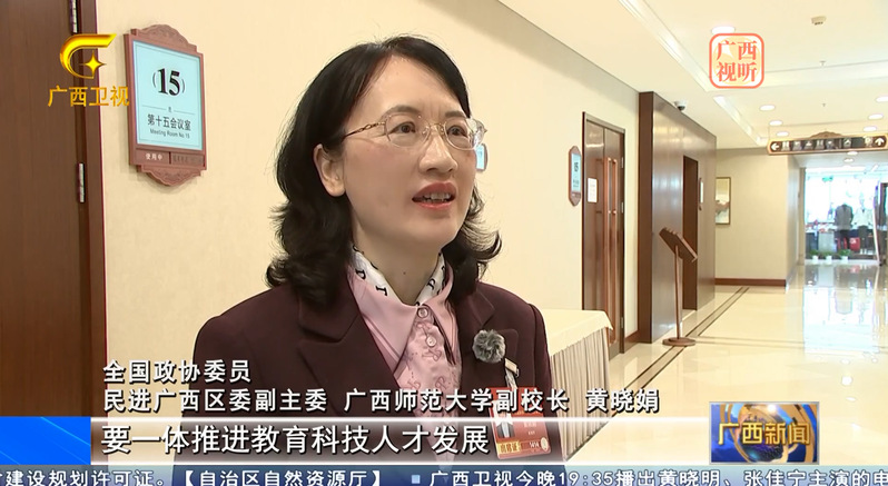3月5日,广西广播电视台关注报道习近平总书记参加十四届全国人大四次会议江苏代表团审议时的重要讲话在广西代表委员和干部群众中引发的热烈反响,全区各界纷纷表示将坚定发展信心、强化使命担当,奋力实现“十五五”良好开局。全国政协委员、民进广西区委副主委、我校副校长黄晓娟结合学校办学实际,畅谈对习近平总书记讲话精神的学习体会与落实举措。