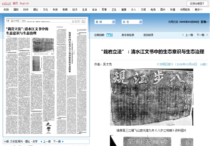 我校历史文化与旅游学院吴才茂教授在2026年3月9日发行的《光明日报》理论版发表题为《“栽岩立法”:清水江文书中的生态意识与生态治理》的理论文章。