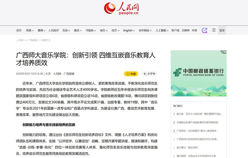 3月13日,【人民网】以《广西师大音乐学院:创新引领四维互嵌音乐教育人才培养质效》为题,关注报道我校音乐学院音乐师范生培养的创新实践与丰硕成果。音乐学院始终坚守立德树人根本任务,紧抓美育改革发展机遇,构建起创新能力与音乐技能、教学能力与表演能力、校内实践与校外服务、科学研究与教学实践“四维互嵌”的人才培养体系,系统展现了学院在一流专业建设、科研教学突破、双创赛事成果、地方美育服务、民族文化传承等方面的亮眼成效。