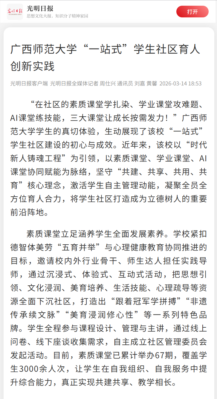 3月14日,光明日报客户端关注报道广西师范大学“一站式”学生社区育人创新实践,我校以素质课堂、学业课堂、AI课堂协同赋能,将学生社区打造成为立德树人的重要前沿阵地,切实打通育人“最后一公里”。