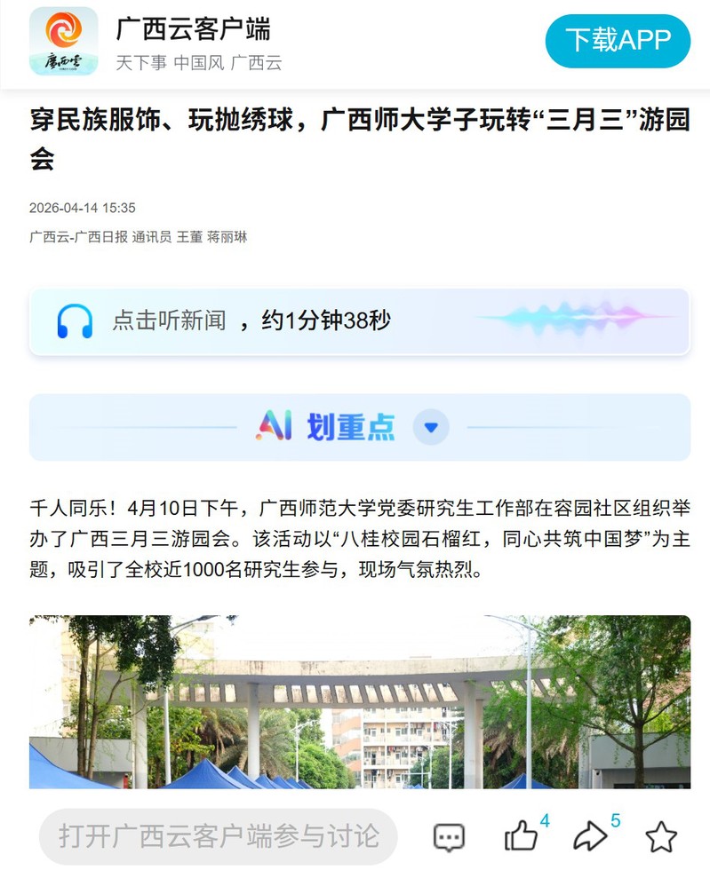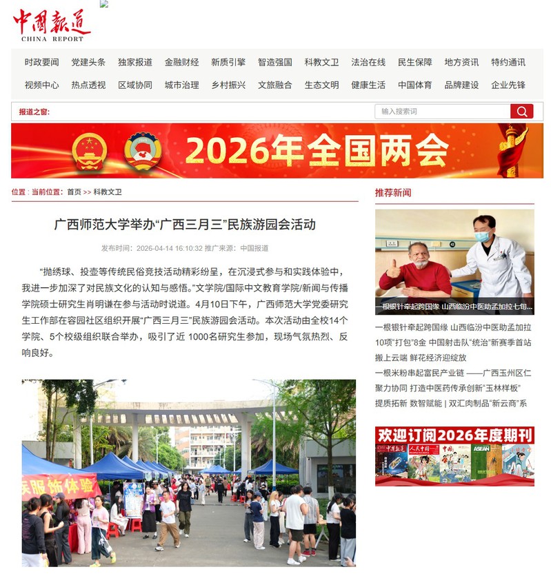 4月14日,【中国报道网】【广西云】关注报道我校举办“广西三月三”民族游园会活动。本次活动紧扣“广西三月三”这一重要节庆节点,以“八桂校园石榴红,同心共筑中国梦”为主题,吸引了全校近1000名研究生参与,现场气氛热烈,是学校推动文化育人、促进民族团结的生动实践。