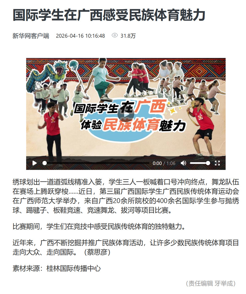 4月16日,【新华网】客户端刊发报道,聚焦第三届广西国际学生广西民族传统体育运动会在我校举办。来自广西20余所院校的400余名国际学生齐聚我校,参与抛绣球、板鞋竞速、竞速舞龙、踢毽子、拔河等民族传统体育项目,在竞技比拼中沉浸式感受广西民族传统体育的独特魅力。